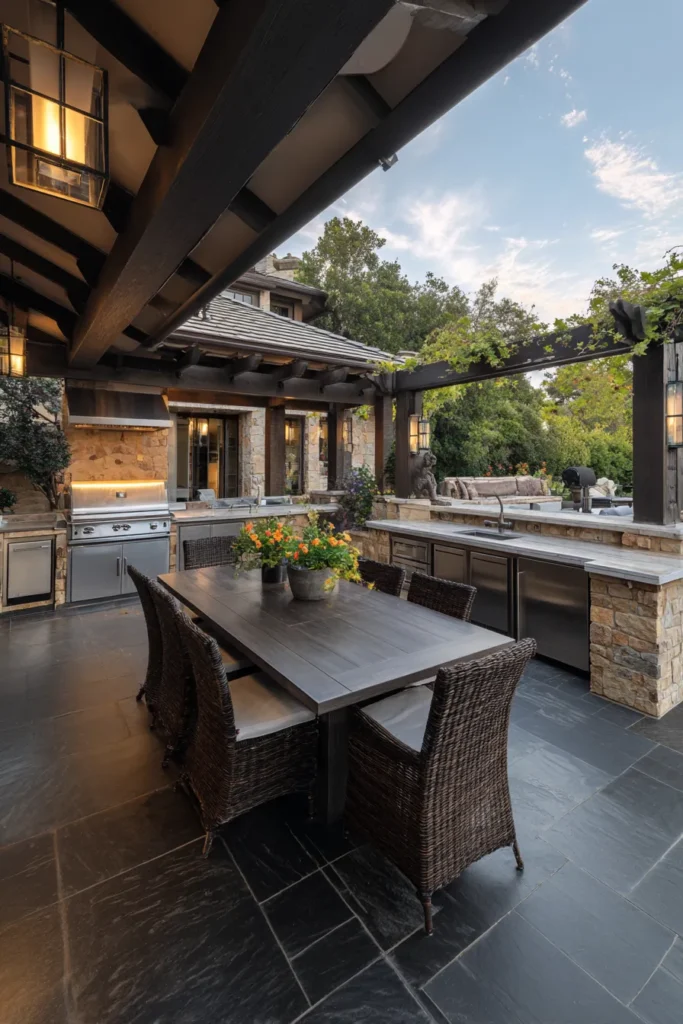 This space makes me want to start planning a fancy outdoor dinner party immediately—it’s just so sophisticated and rich. The contrast between the dark, dramatic wood beams and the textured stone work on the kitchen island is incredibly striking and gives the area so much character. I love how the comfortable wicker dining chairs feel both elegant and relaxed, making this the perfect year-round spot for a fabulous meal.