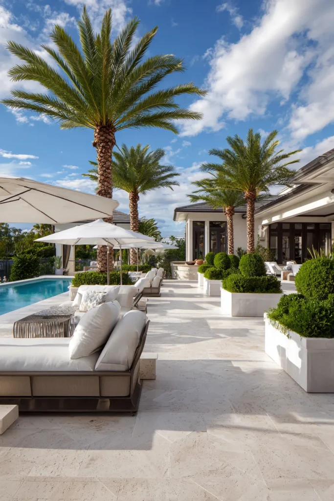Get ready for some serious vacation vibes with this luxurious pool patio that feels like a five-star resort. The expansive deck is paved in light, elegant travertine, which keeps the area cool and bright. Rows of beautiful date palm trees and manicured boxwood shrubs in crisp white planters provide a stunning vertical element and a touch of lush tropical greenery. The modern lounge chairs with thick, plush cushions are perfectly positioned for soaking up the sun next to the sparkling pool.