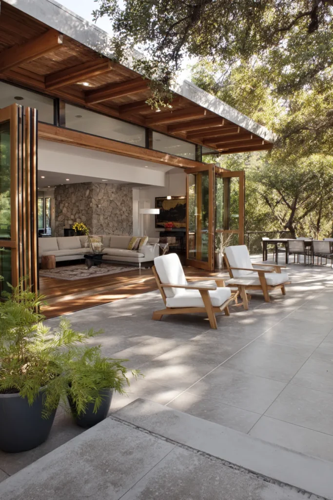 This is the definition of dream home living—I just can’t get enough of how completely open and breezy the space feels. The richness of the natural wood is so inviting, and the way the outside light floods the living room is just beautiful. It’s such a brilliant way to extend your usable living space, making the patio feel like a true outdoor great room that’s perfect for both casual relaxing and elegant hosting.