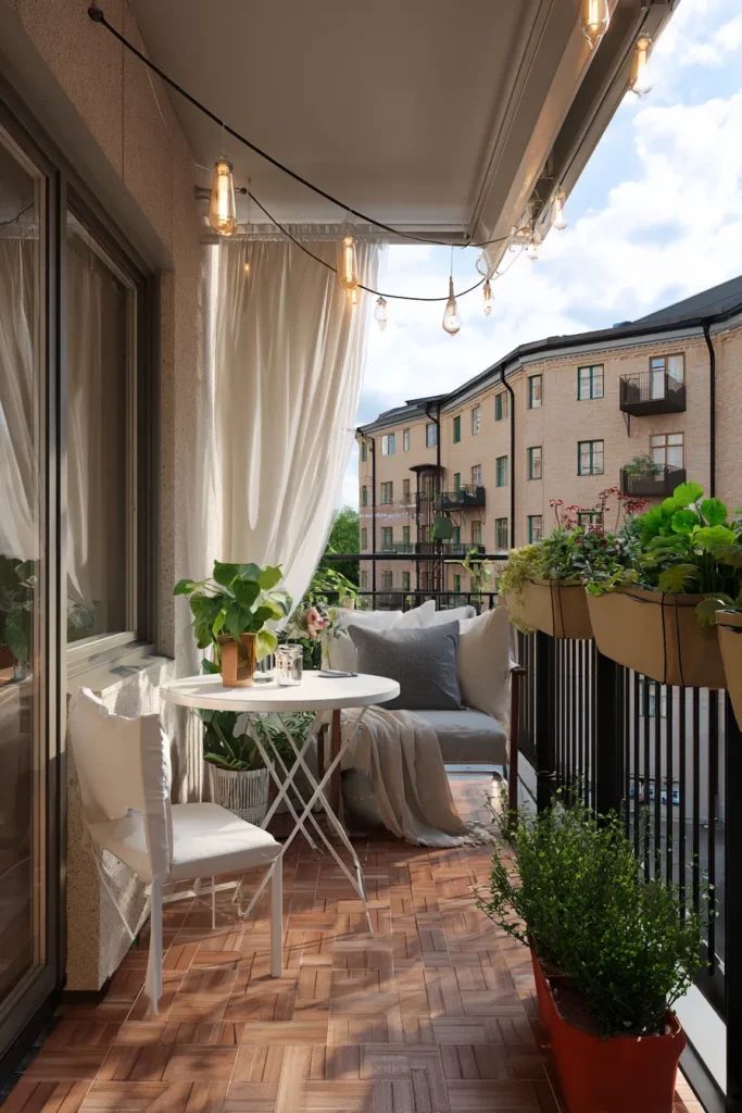 This small balcony feels open and inviting with soft white curtains, cozy string lights, and wooden floor tiles that add warmth. A tiny round table and a cushioned chair create just enough space for morning coffee or evening wine. Planters overflowing with greenery line the railing, making the balcony feel like a peaceful pocket of nature even in the middle of the city.