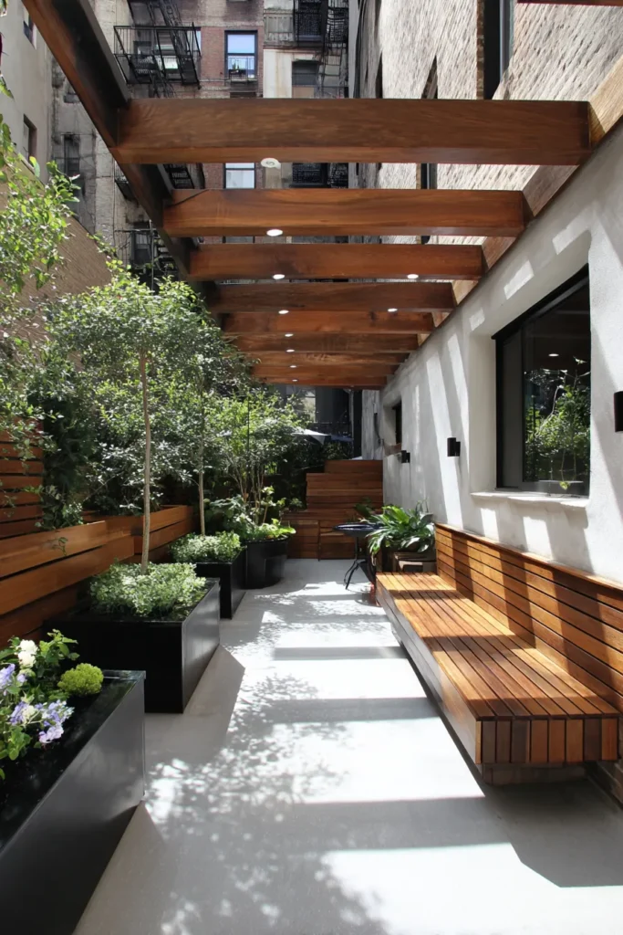 This long patio combines urban design with natural comfort. Wooden benches and planters add warmth against concrete walls, while an open wooden pergola filters soft sunlight. Greenery in black planters adds contrast and a touch of lush life.