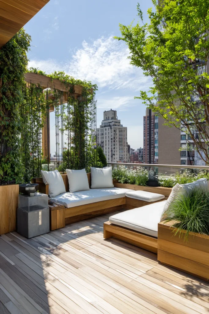 This rooftop patio blends city energy with natural calm. Wooden seating, lush vines, and a view that stretches across the skyline make it feel open yet private. Light wood tones and white cushions keep the space airy while the plants add a refreshing balance.
