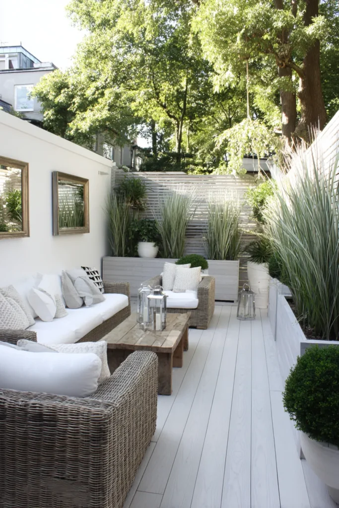 This small garden patio feels crisp and welcoming with soft wicker furniture, white cushions, and layered greenery. Tall grasses along the walls create height, while mirrors reflect light and make the area feel larger. The wooden coffee table and lanterns tie the cozy look together.