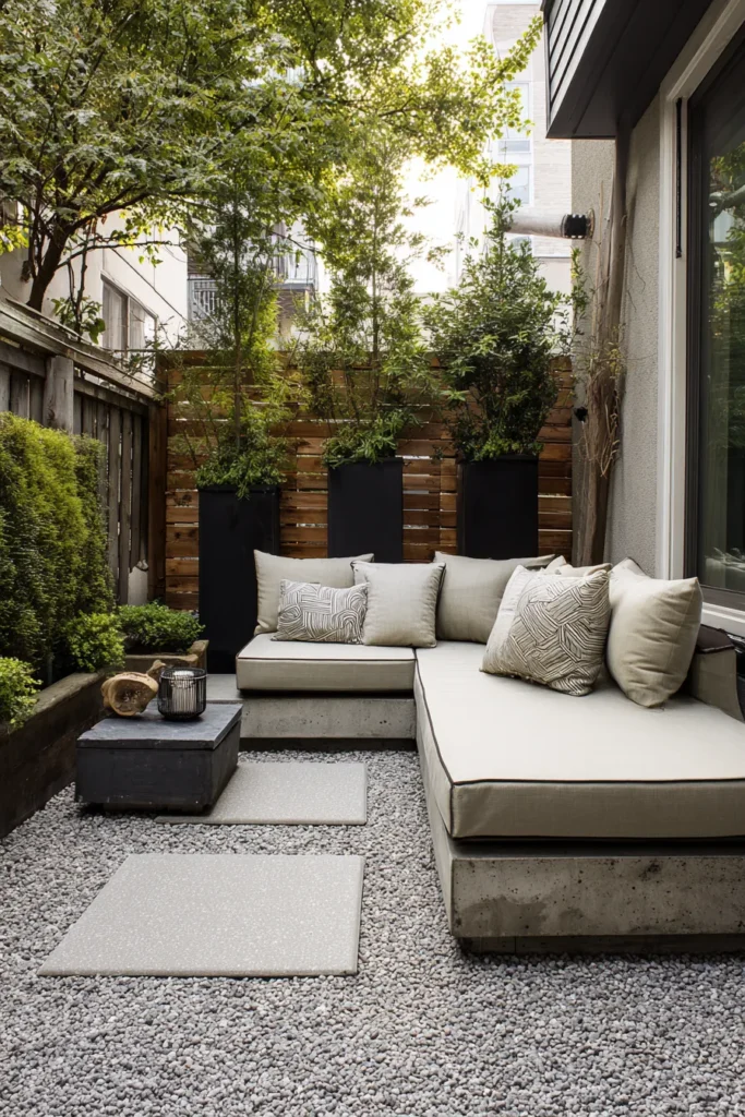 This patio turns simplicity into luxury with its gravel flooring, sleek furniture, and subtle greenery. The clean lines of the L-shaped seating make the space functional and uncluttered, while the neutral tones feel timeless.