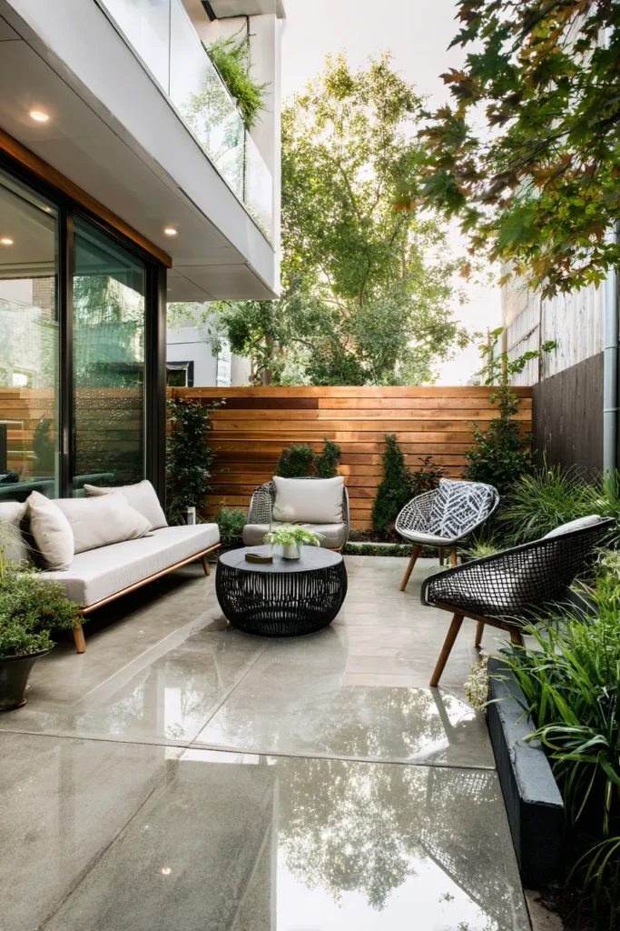 This space shines with modern balance — glossy floors, warm wood fencing, and black wire furniture. Green plants around the edges add life, and the mix of textures keeps the design interesting without feeling heavy.