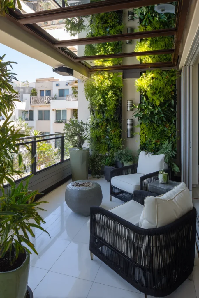This balcony feels lush and modern thanks to the vertical garden climbing up the wall. Dark furniture, large pots, and a glass railing create depth and light, while the greenery softens the contemporary structure.