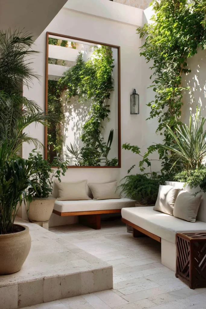 I can’t get over how clever that mirror is. It doubles the greenery visually and makes the courtyard look twice its size. The soft color palette feels fresh and serene — I’d love to unwind here after a long day.