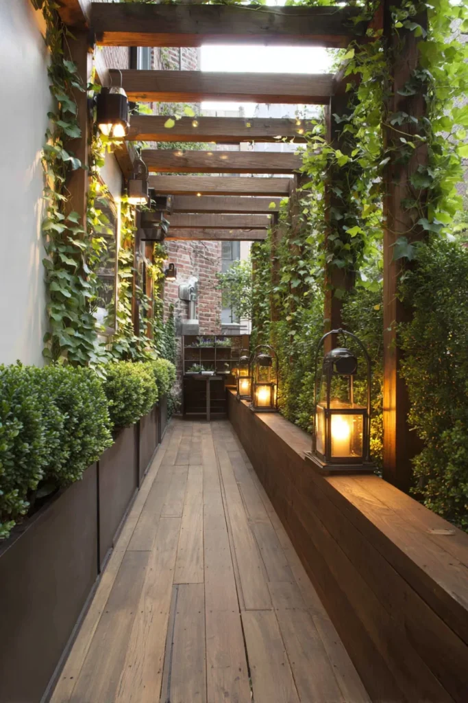 I find this design so inviting. It turns a tight walkway into a dreamy little passageway, perfect for evening relaxation. Those glowing lanterns give it the perfect romantic touch.
