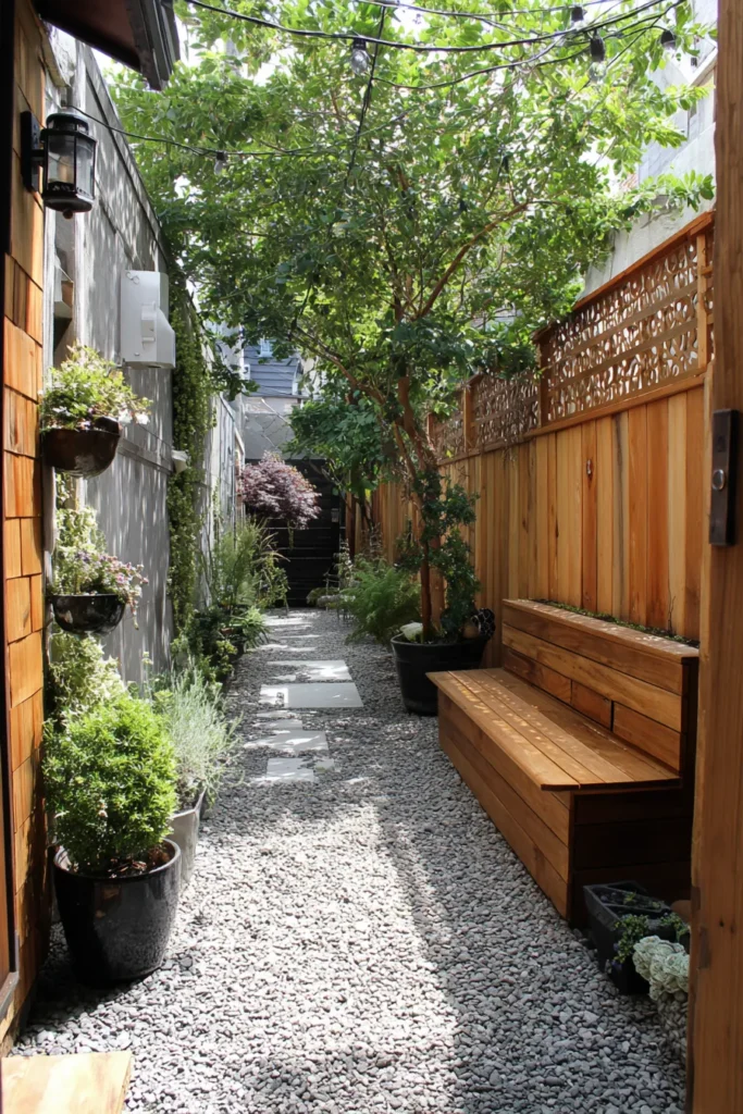This compact patio feels charming and natural with its gravel path, wooden fencing, and built-in bench. Hanging planters and lush trees create a private green escape, even in a narrow side yard.