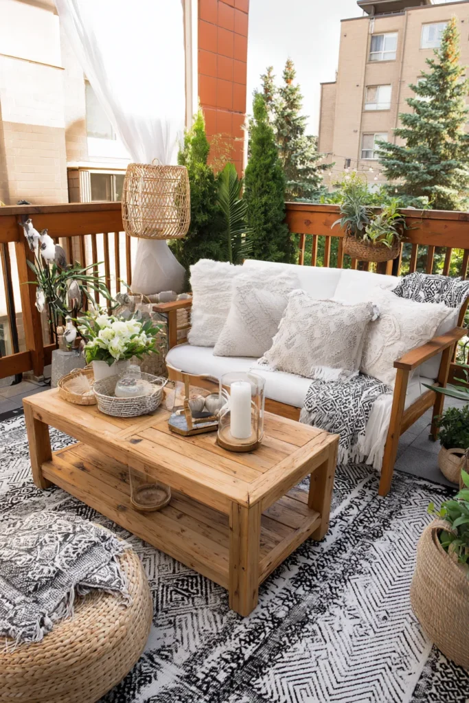 This patio balances coziness and texture beautifully. The wooden loveseat is filled with soft, neutral pillows, and the natural fiber rug adds instant charm. Woven baskets, rattan decor, and greenery complete the space, making it feel like a relaxing outdoor living room.