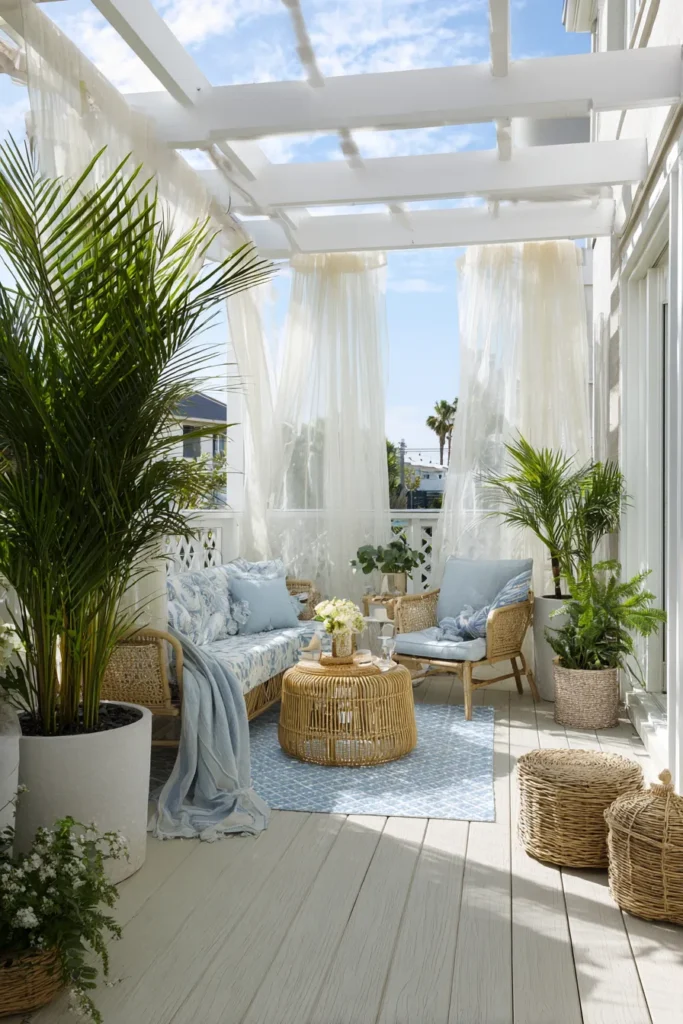 This patio brings beach house vibes to any small space. Light wicker furniture, sheer white curtains, and sky-blue cushions keep everything soft and refreshing. Lush plants frame the scene, and the sunlight dances through the airy fabric, filling the space with life.