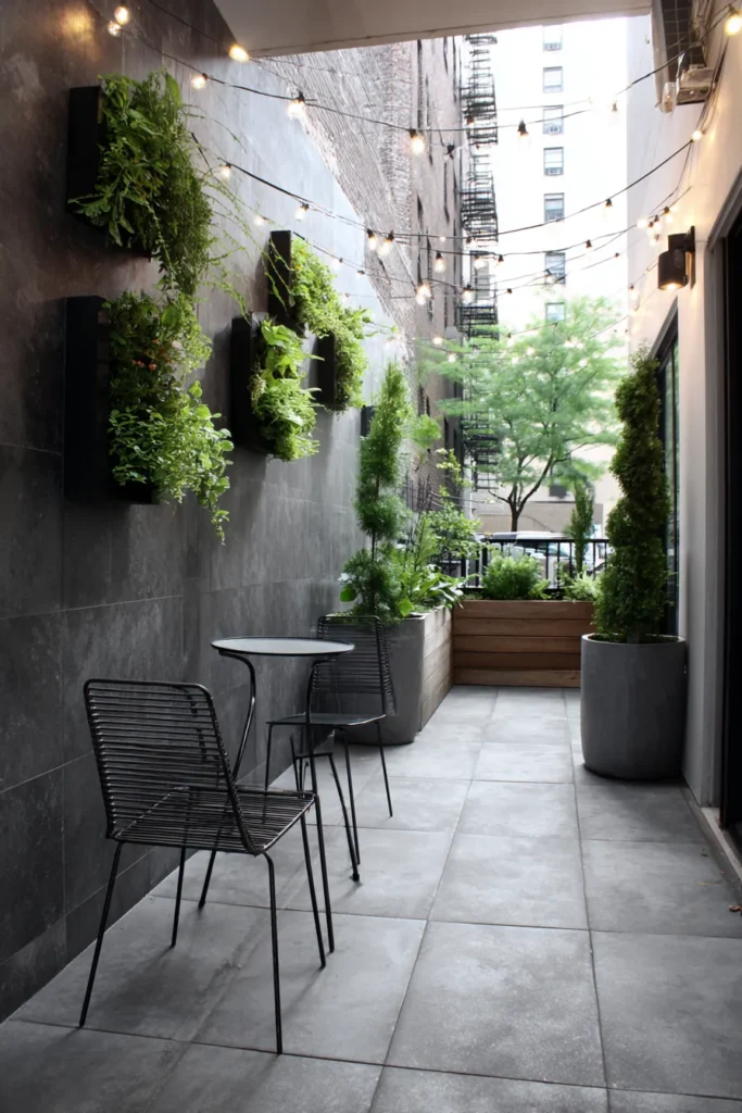 This sleek modern patio turns a narrow space into something stylish and green. Dark walls make the plants pop, while string lights add a cozy glow above. Wall-mounted planters and tall greenery make the space feel taller and more open.