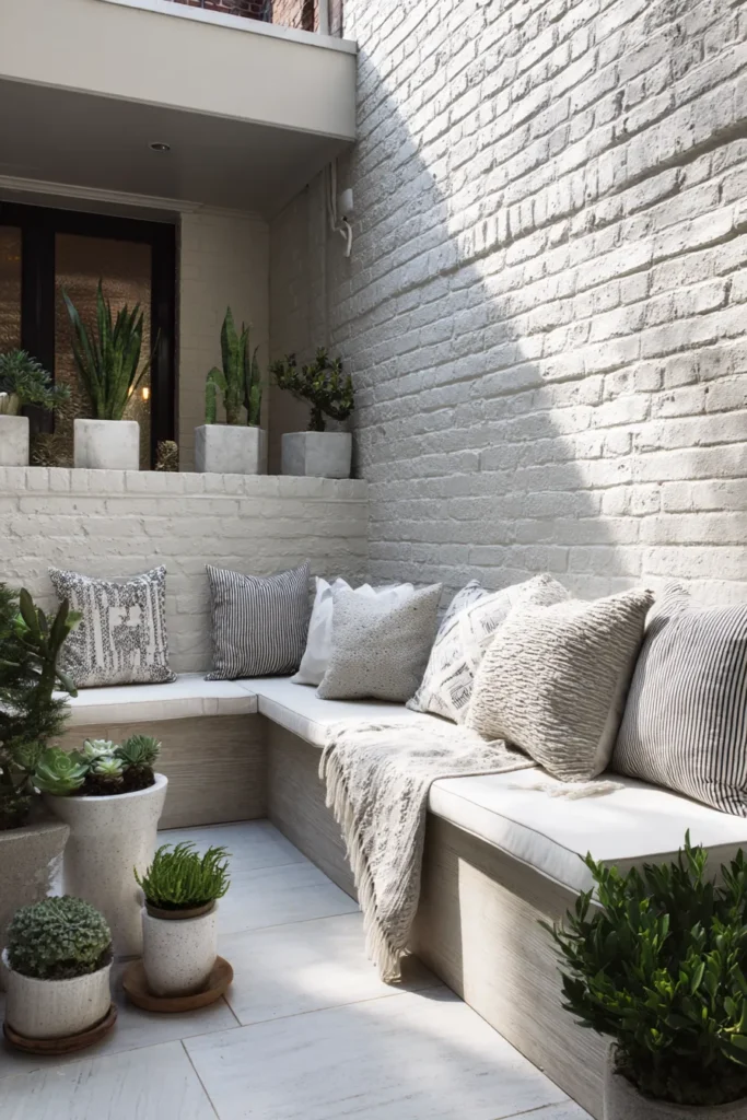 This patio shows how simplicity can feel so soothing. White brick walls, soft gray cushions, and matching planters create a clean, calm space. The built-in bench maximizes seating while keeping the design sleek and open.