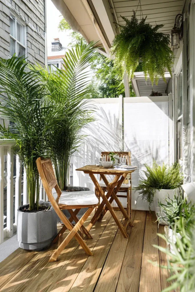 This balcony feels like a mini tropical retreat. Wooden chairs, lush palms, and hanging ferns make it feel alive and bright. The privacy screen adds a cozy touch while letting light pour through the leaves.