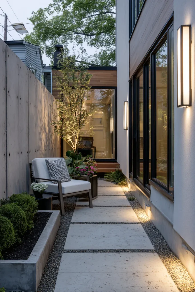 This slim patio feels warm and inviting thanks to clever lighting and thoughtful details. Concrete planters, clean lines, and a mix of greenery make the walkway cozy instead of cramped. The glow from the wall lights adds a soft, intimate feel.