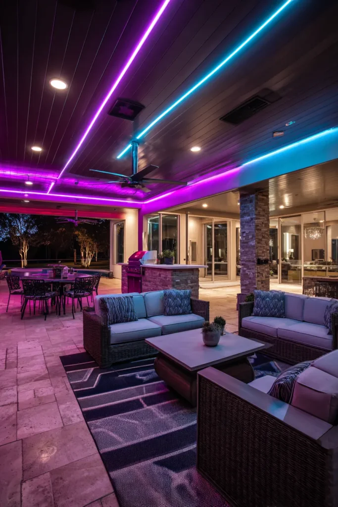 I’m honestly obsessed with how bold and unexpected this lighting choice is for a home patio. It completely transforms a traditional outdoor space into a chic, resort-style lounge that feels ready for a fabulous party. If you’re into making a huge statement and breaking away from just warm white lights, this futuristic look is incredibly impressive and just screams good times and great design.