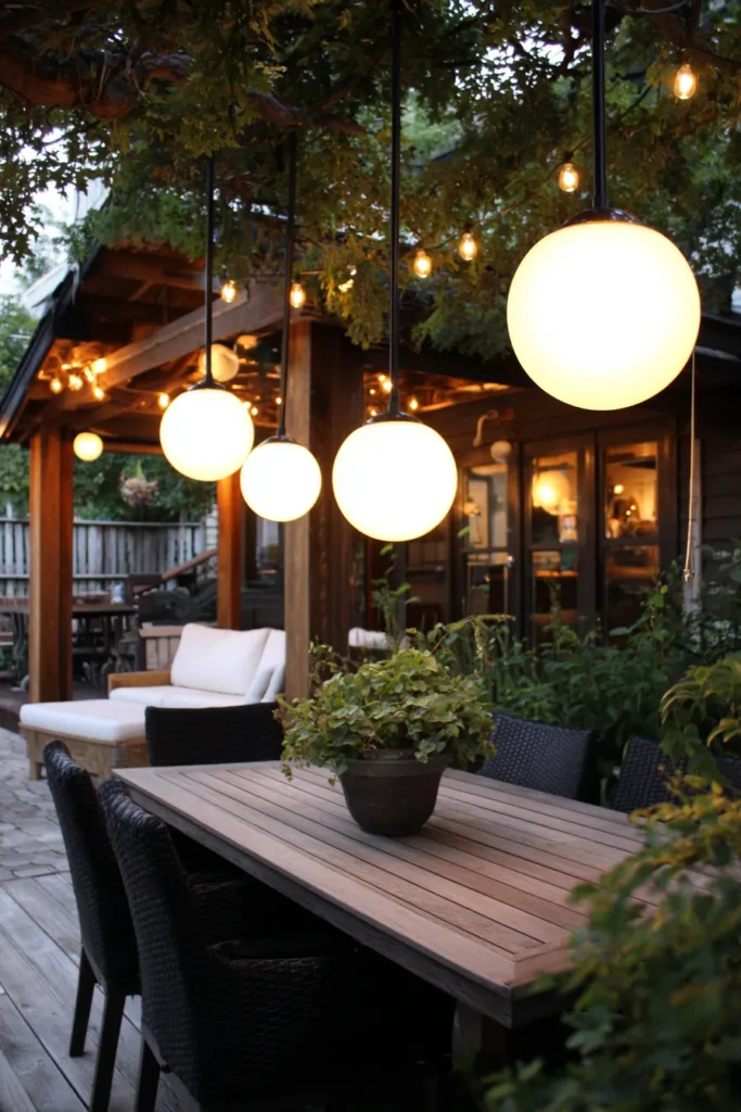 Talk about bringing some fun, mid-century modern flair to the outdoors! This lovely patio is set against a backdrop of rich, dark greenery and features a comfortable dining area under a rustic wooden structure. The lighting is absolutely captivating, thanks to a row of massive, luminous white globe lanterns suspended over the table, providing a beautifully diffused and soft glow that is just so flattering.