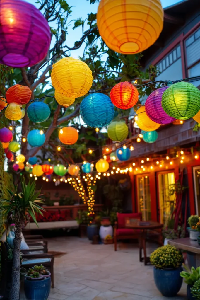 This patio is a burst of pure, joyous energy, bringing a delightful, carnival-like atmosphere right to the backyard. The design is all about color and layers, with strands of classic string lights mixed with an amazing collection of vibrant paper lanterns in every shade of the rainbow. This creates a dazzling canopy overhead that absolutely transforms the space into a super fun, celebratory scene perfect for any casual party or summer evening.