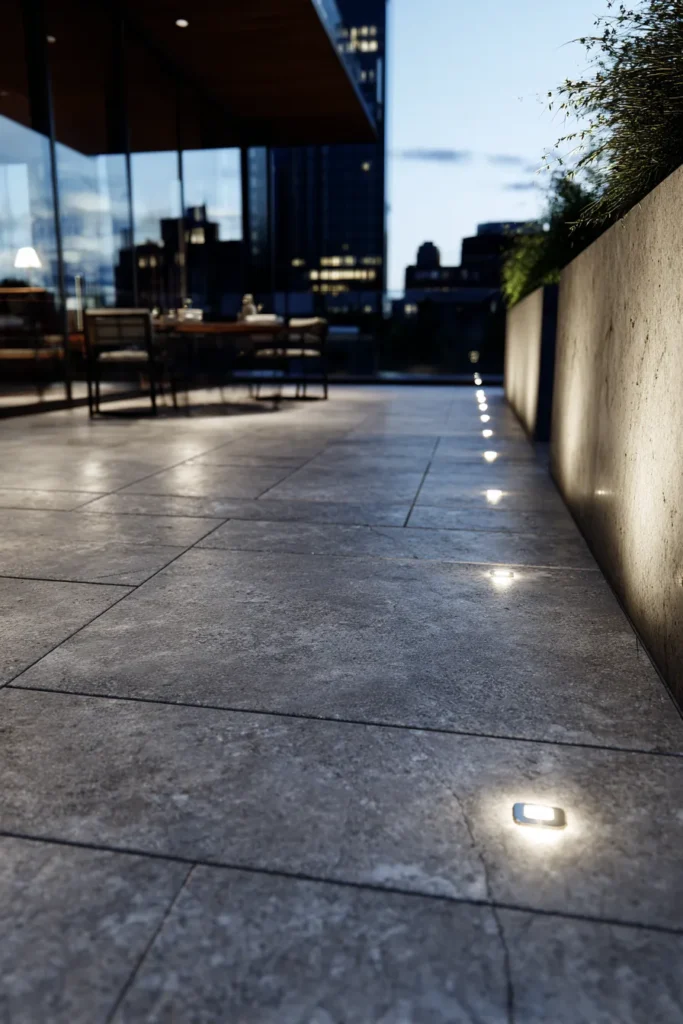 This sophisticated patio embraces sleek, high-rise living with a dark, polished concrete floor and a clean, minimalist design. The view of the city skyline is the natural focal point, and the lighting is kept deliberately understated to enhance it. Small, flush-mounted LED spotlights are embedded right into the paving stones along the edge, providing subtle ground-level guidance and a hint of warm light that keeps the space feeling anchored and incredibly chic after sunset.