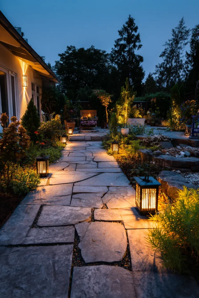 I just adore the storyteller vibe of this design—it feels like it leads to a secret, cozy destination. The layered lighting, with the path lights highlighting the journey and the lanterns adding a touch of romance, is simply captivating. It’s an incredibly picturesque and welcoming way to light up a walkway, making even a short stroll feel like a truly serene and magical experience.