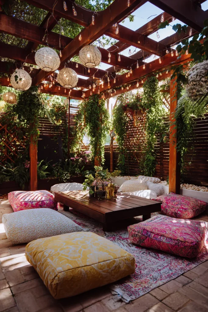 I’m utterly charmed by this design because it just radiates such a warm, free-spirited, and incredibly cozy atmosphere. It feels like a secret garden hideaway, full of personality and charm, where every detail encourages relaxation and joyful connection. The clever use of soft lighting woven through the pergola really makes the whole space sparkle, promising countless magical nights under the stars.