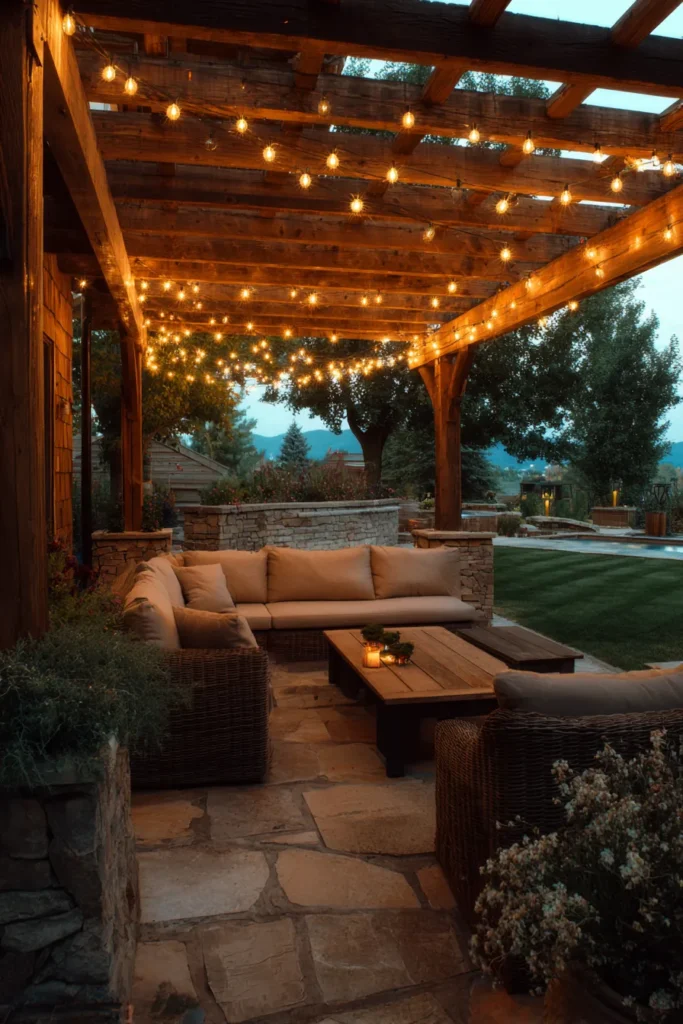 This expansive patio creates the ultimate cozy outdoor living room, defined by a gorgeous wooden pergola that frames the space perfectly. Beneath the pergola, deep, plush outdoor furniture invites you to settle in for the night. The crowning glory is the abundance of warm string lights—perhaps classic market or cafe style—strung densely across the entire ceiling of the pergola, creating a dazzling canopy of light that transforms the area into a glowing, intimate retreat.