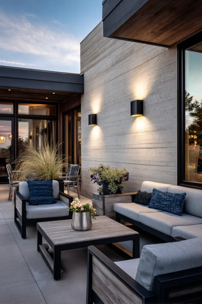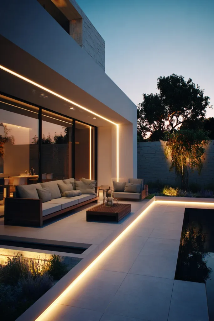 I think this patio is simply stunning because it proves that you don’t need a lot of fuss or clutter to achieve a luxurious and inviting outdoor space. The lighting is a masterclass in subtlety, highlighting the beautiful materials and structure of the home rather than screaming for attention. It feels so incredibly serene and put-together, and I can just picture myself having a perfectly chic and peaceful evening here.
