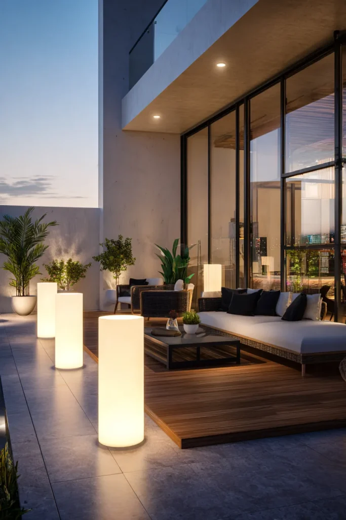 Honestly, I think this look is incredibly cool because it uses light in such a structural and innovative way, turning the patio floor itself into a piece of illuminated art. It feels super high-end and just a little bit futuristic, proving that lighting can be just as important as the furniture in setting a gorgeous mood. It’s the perfect design if you want your outdoor space to feel like a chic urban retreat after dark.