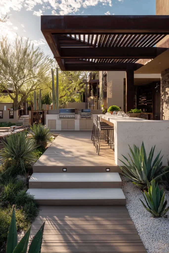 I’m utterly obsessed with how this space combines that natural desert aesthetic with such clean, contemporary lines, it’s just so unexpected and cool! The choice of the corten steel for the pergola is pure genius because it looks so dramatic and perfectly complements the arid landscape. Extending the living space to include such a fully equipped outdoor kitchen and bar is the ultimate dream for hosting—I can already hear the laughter and smell the delicious food. This design proves that even in a rugged environment, you can create an exceptionally luxurious and stylish outdoor sanctuary!