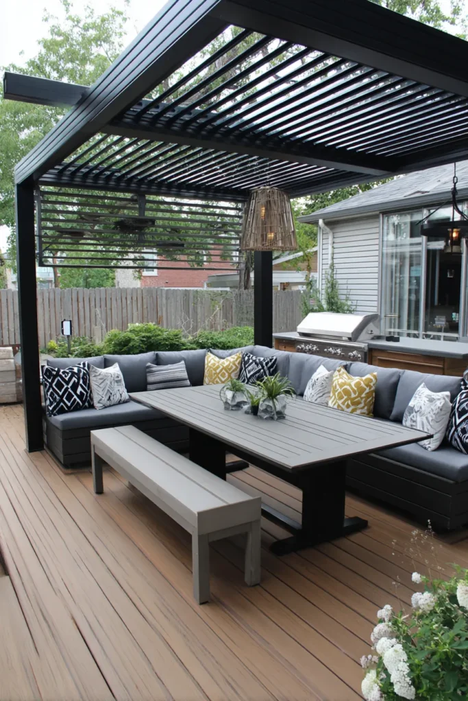 This is a totally stunning and sophisticated outdoor dining space that proves small backyards can still make a huge design statement! The warm, rich brown decking provides a cozy base, which is immediately contrasted by the striking black metal pergola overhead. This pergola has sleek, adjustable slats for controlling the sun and creates an incredibly defined outdoor room. The seating is absolutely genius, featuring a built-in U-shaped sectional in a deep charcoal fabric, perfectly maximizing the space around a contemporary dining table. They’ve styled it with a gorgeous mix of patterned pillows in black, white, and cheerful yellow—that pop of color is everything! A fun woven pendant light hangs in the center, and a convenient outdoor kitchen/grill area is tucked neatly along the back.