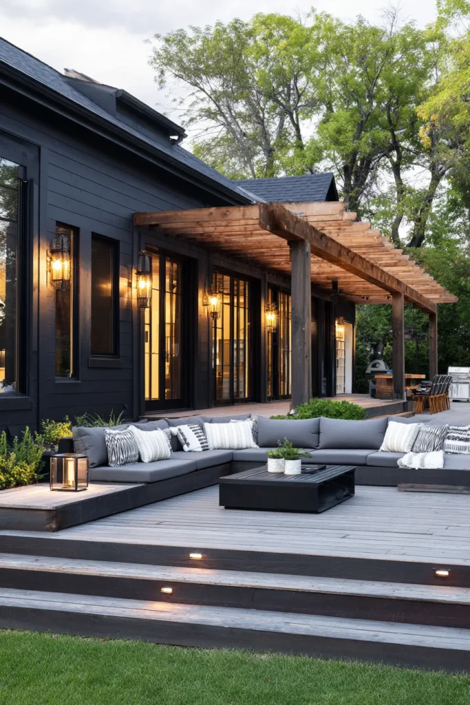 Oh my goodness, this deck is the perfect blend of moody drama and rustic warmth—it’s absolutely captivating! The home itself is painted a striking matte black, which provides the chicest backdrop for the extensive outdoor living area. The deck is constructed with gorgeous wide gray planks that step down to the lawn, complete with subtle recessed lighting for a lovely glow after dark. A stunning attached pergola with thick, natural, reclaimed-look wood beams runs along the house, creating a wonderful shelter for the patio doors and a dedicated lounge space. The seating is a massive, low-profile gray sectional piled high with graphic black and white pillows, centered around a sleek black coffee table. The entire space is accented by warm lantern sconces on the house and plenty of greenery.