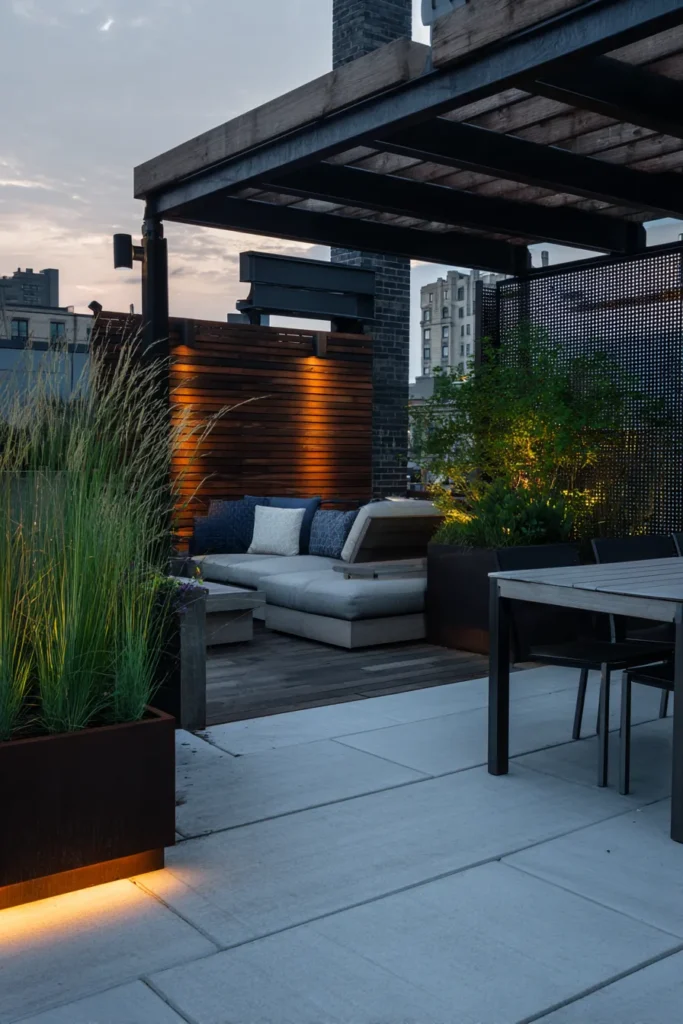 This rooftop deck is the ultimate lesson in sophisticated urban style, combining raw, industrial materials with cozy, luxurious seating. The flooring cleverly mixes cool, large concrete pavers in the foreground with warm, natural wood decking underneath the lounge area. An attached pergola features a bold black metal frame topped with thick, rustic wood beams, creating a stunning, high-contrast shelter. The space is expertly zoned with privacy screens, including a gorgeous wood-slat wall that’s beautifully uplighted with warm sconces. Large planter boxes with a gorgeous weathered Corten steel finish hold tall grasses, adding major texture and a beautiful, moody glow from the integrated base lighting.