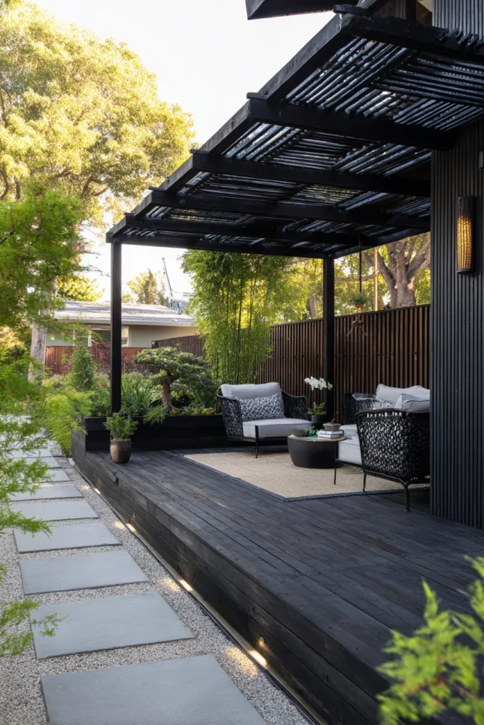 This gorgeous deck is giving us major Zen garden vibes, perfectly blending sleek, dark design with natural tranquility! The decking features extra-wide planks stained a rich, deep black, providing a stunning contrast to the surrounding greenery and a crisp, clean base. An attached, all-black pergola covers the lounge area, its densely slatted roof casting beautiful patterns of light and shadow, creating the most serene atmosphere. The walls are enclosed with stylish vertical wood slat fencing in coordinating dark tones, ensuring privacy. A cozy seating area sits atop a light natural fiber rug, framed by a built-in planter with a perfectly sculpted bonsai tree and other lush foliage. A stepping stone path laid in white gravel leads the eye through the garden.
