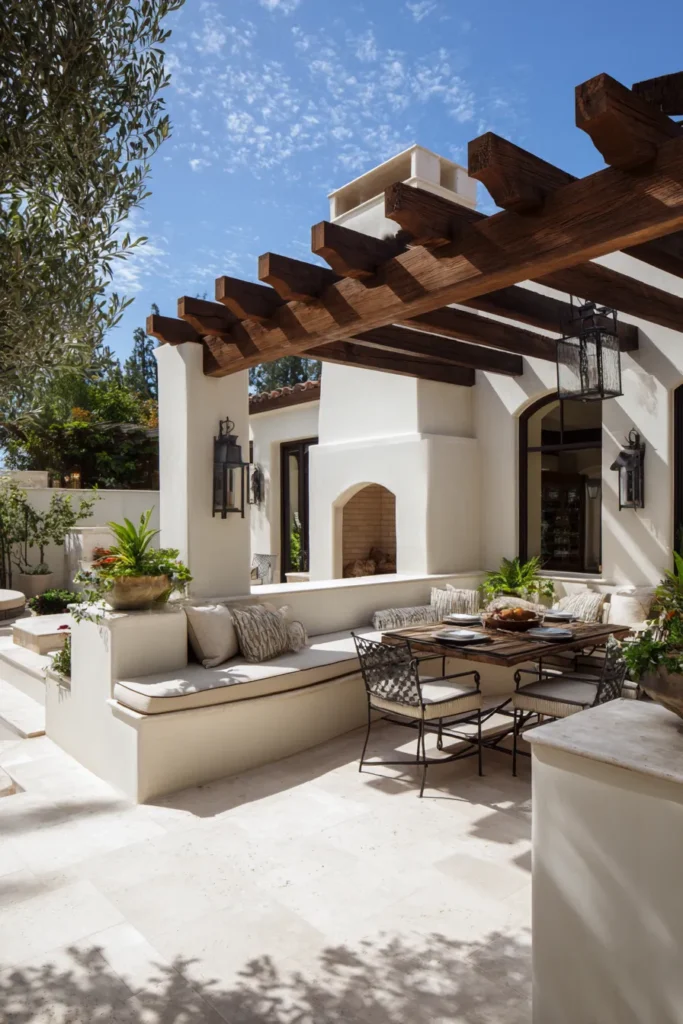 I am completely in love with the combination of that plastered, creamy architecture and those incredibly chunky, dark wood beams—it’s just pure magic! The built-in seating is such a clever way to make the space feel custom and inviting, perfect for long, relaxed afternoons chatting with friends. Having the fireplace right there is the ultimate dreamy detail for extending the use of the space well into the cooler evenings. This design truly shows how a pergola can be the main architectural feature that defines an entire, beautiful outdoor living room.