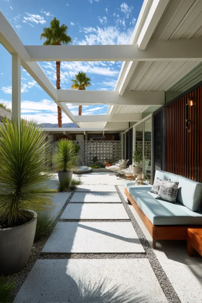 This patio design is a total homage to Mid-Century Modern style, giving us serious Palm Springs, California vibes! The floor is super chic, made up of large square terrazzo pavers separated by clean strips of gravel, which creates an awesome graphic pattern. The attached pergola features crisp, thick white beams that extend straight out from the house, providing a structured, geometric shade pattern that is so characteristic of the era. A long, built-in daybed with a gorgeous light blue cushion and a simple wooden base is perfect for lounging. The space is accented with architectural desert plants, like a spiky yucca in a concrete pot, and a cool breeze block wall visible in the background, adding that authentic retro texture.