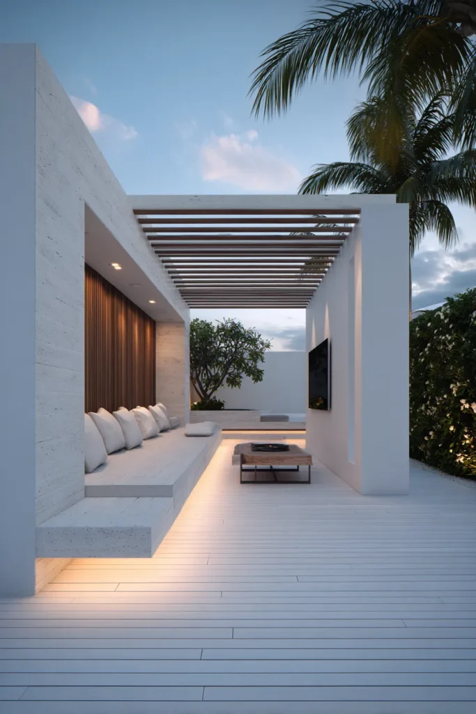 Wow, this space is absolutely breathtaking and feels like a five-star resort cabana—it’s pure luxury and serenity! The design is ultra-modern, featuring crisp white walls and flooring that create a stunning, minimalist envelope. The attached pergola uses clean, horizontal dark wood slats that provide a beautiful contrast to the white stone structure and cast lovely shadows. Inside the cabana, there’s a gorgeous built-in stone bench with soft white cushions, offering an inviting spot to lounge, and it’s beautifully accented by hidden lighting underneath that gives it a warm, floating glow. The back wall is clad in beautiful dark vertical wood paneling, adding rich texture, and there’s even an outdoor TV for the ultimate movie-night setup!