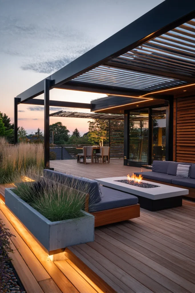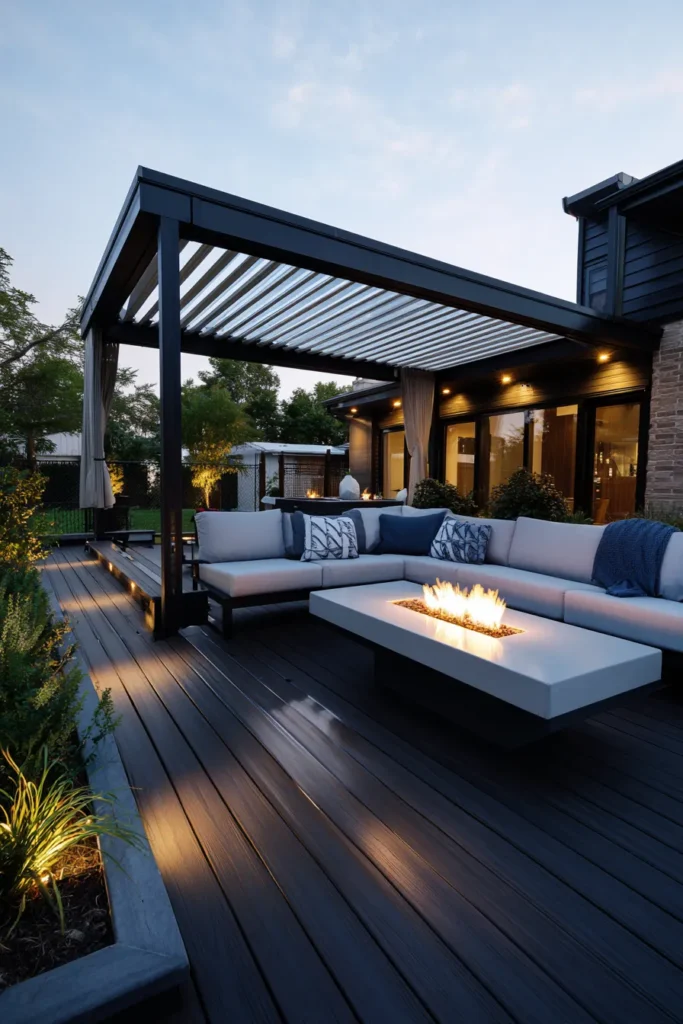 What I truly adore about this design is the incredible luxurious feel and the attention to detail in the lighting. The dark colors are so rich and moody, making the whole area feel like a high-end lounge that’s just begging you to relax. That combination of the sleek pergola and the stunning fire feature makes this more than just a deck, it’s a completely glamorous extension of the home. Honestly, who needs a formal living room when you have a dazzling space like this right outside your door?