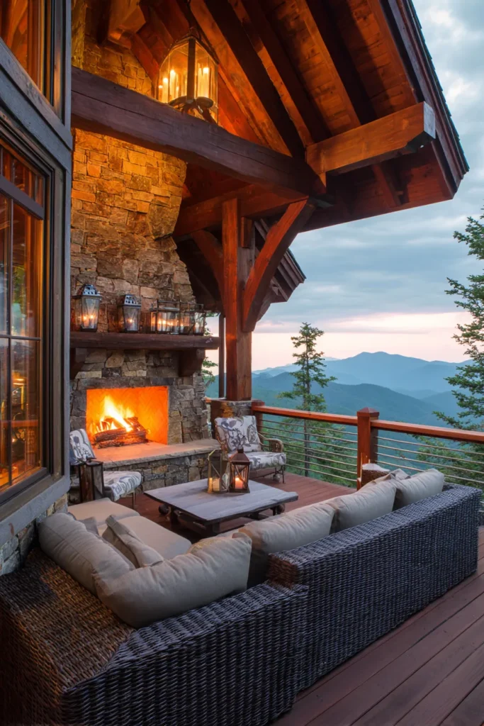 This deck is the absolute picture of rustic elegance and feels like the coziest spot on earth, especially with that spectacular mountain view! The space is built with rich, dark wood decking and features a beautifully crafted timber frame roof that functions as the attached pergola, using thick, exposed beams and posts for that authentic cabin aesthetic. The true heart of the space is the massive floor-to-ceiling stone fireplace, which creates an incredible focal point and provides so much warmth and ambiance. The seating is a gorgeous, chunky wicker sectional with plush, neutral cushions that just scream “snuggle up.” Stylish lanterns sit on the mantel and the coffee table, casting a warm, inviting glow over the entire outdoor room.