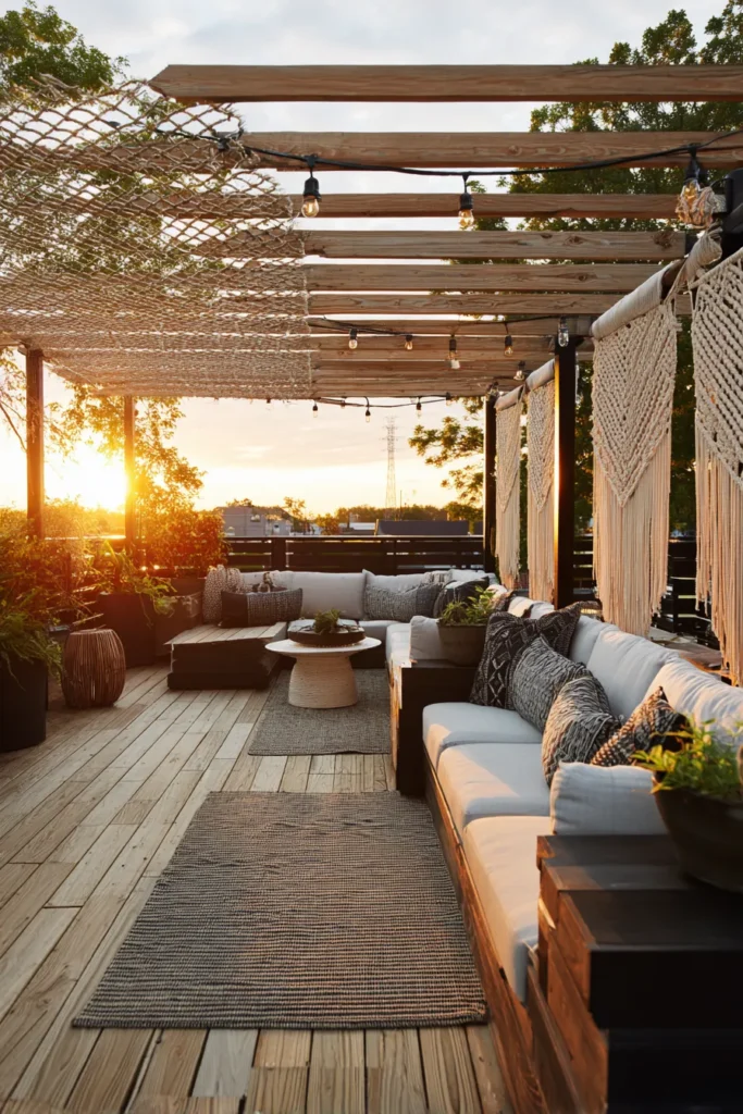 Oh my goodness, this rooftop deck is an absolute dream, boasting a seriously chill vibe that’s just perfect for unwinding! The flooring is all gorgeous natural wood decking, giving it that lovely warm, inviting feel. A sturdy pergola made from light-toned timber beams covers the space, creating a wonderful sense of enclosure without blocking out the sky. It’s even got some super cute string lights draped across the top and a cool woven netting, which adds a touch of rustic charm and a bit more filtered shade. There are these stunning macramé panels hanging down one side, adding major bohemian style and a little privacy. The seating is all about comfort with plush outdoor sectional sofas in light fabrics, loaded up with textured pillows that just scream “cozy.” Lush potted plants are dotted around, bringing in that fresh, natural element. And that sunset? Pure magic!