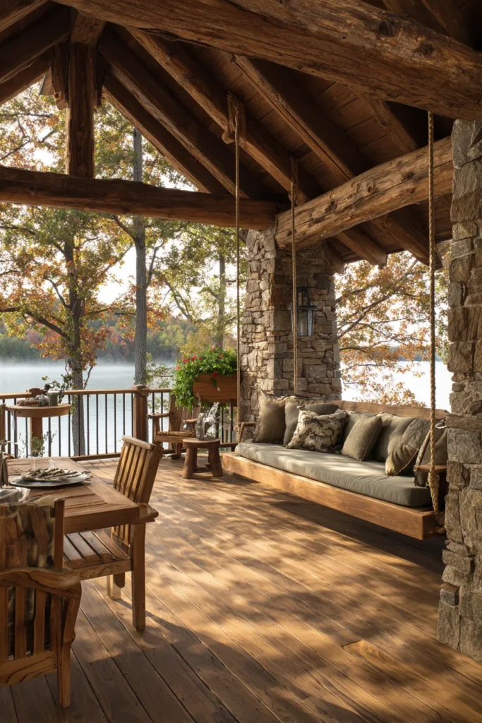 This porch is the absolute definition of a cozy cabin dream and just oozes rustic charm right by the water! The flooring is a beautiful natural wood deck with planks of varying tones, giving it such a lovely texture underfoot. The attached pergola/porch roof is built with massive, raw-looking log and timber beams, which gives the whole structure an incredibly authentic, lodge-like feel. This space is defined by stunning stone pillars that anchor the structure and house a charming lantern sconce. The star of the show is clearly the wooden daybed swing, hanging from the rafters with thick ropes and piled high with plush, earthy-toned pillows—it looks impossibly inviting! A separate dining area with chunky wood furniture sits nearby, all set against a beautiful backdrop of the lake and autumn trees.
