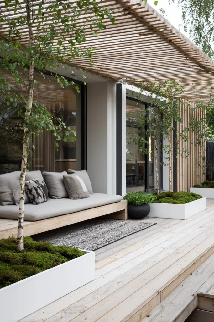 This is such a fresh and calming deck design, giving off serious Nordic minimalist vibes with its clean lines and beautiful use of natural materials. The flooring is done in light, wide wood planks, which flow seamlessly into a gorgeous attached pergola constructed with closely spaced wood slats overhead. This dense slatted roof creates an incredible pattern of light and shade that feels so serene. The space is beautifully segmented by white planter boxes filled with lush, vibrant green moss and delicate birch trees, perfectly blurring the line between architecture and nature. A simple, built-in wood daybed with light gray cushions provides an inviting spot to lounge, kept tidy by a cute little patterned rug underneath.