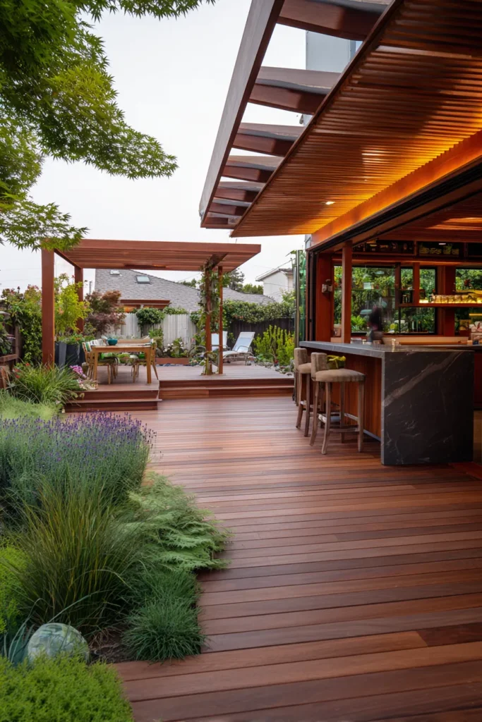 This gorgeous outdoor space is a dream for anyone who loves to entertain, seamlessly blending dining, lounging, and bar areas! The deck itself is crafted from stunning rich, reddish-brown wood planks, creating a warm, continuous floor that steps up to a separate, slightly elevated section. The main pergola is attached right over the house’s sliding glass doors, its slatted roof beautifully covering a full outdoor bar with dark marble and warm wood paneling. A second, freestanding pergola defines the elevated dining area, providing a lovely, intimate atmosphere. Lush, layered planting beds filled with grasses and purple flowers soften the edges and make the whole area feel like a private garden retreat.