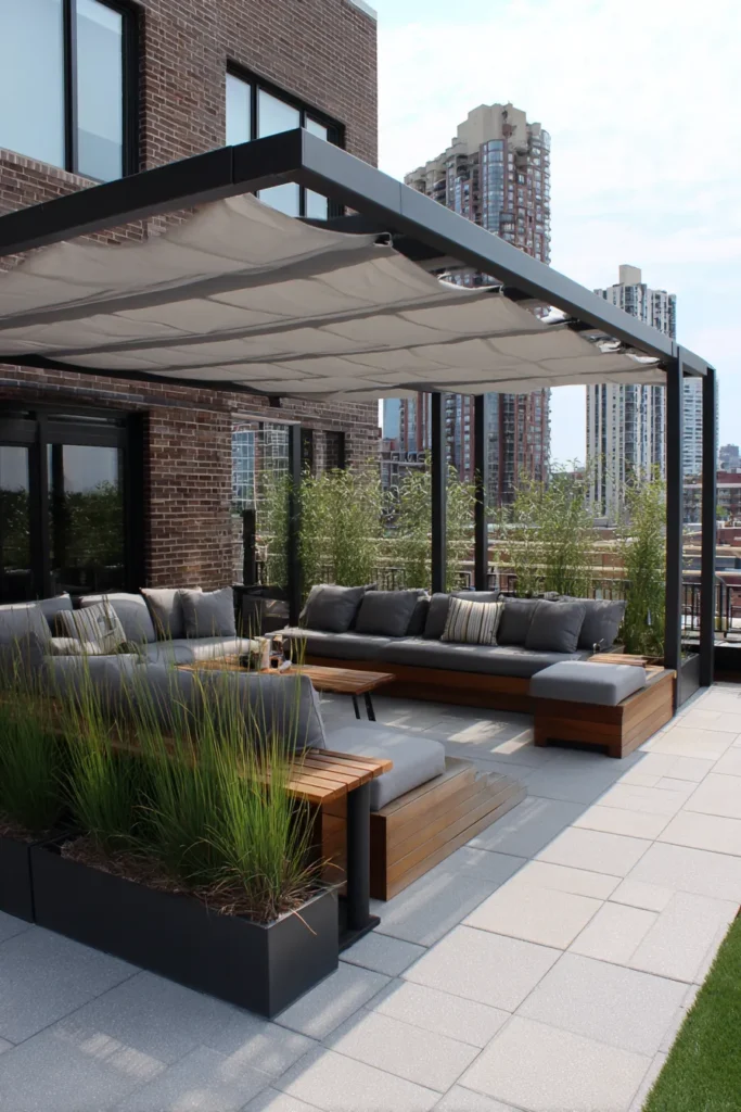 This incredible city rooftop deck is the ultimate example of a stylish, functional urban oasis! The flooring features sophisticated large square gray pavers, which provide a clean, contemporary base for the outdoor living room. A commanding black metal pergola is attached to the brick building, offering a strong, modern structure, and it’s outfitted with a fabulous retractable white fabric canopy for customizable shade—pure genius for those super sunny days. The seating is a massive, built-in modular sectional with wood bases and plush gray cushions, giving off that perfect lounge vibe. Long, dark planter boxes filled with tall, airy grasses create natural privacy screens and beautifully define the seating area from the rest of the patio.