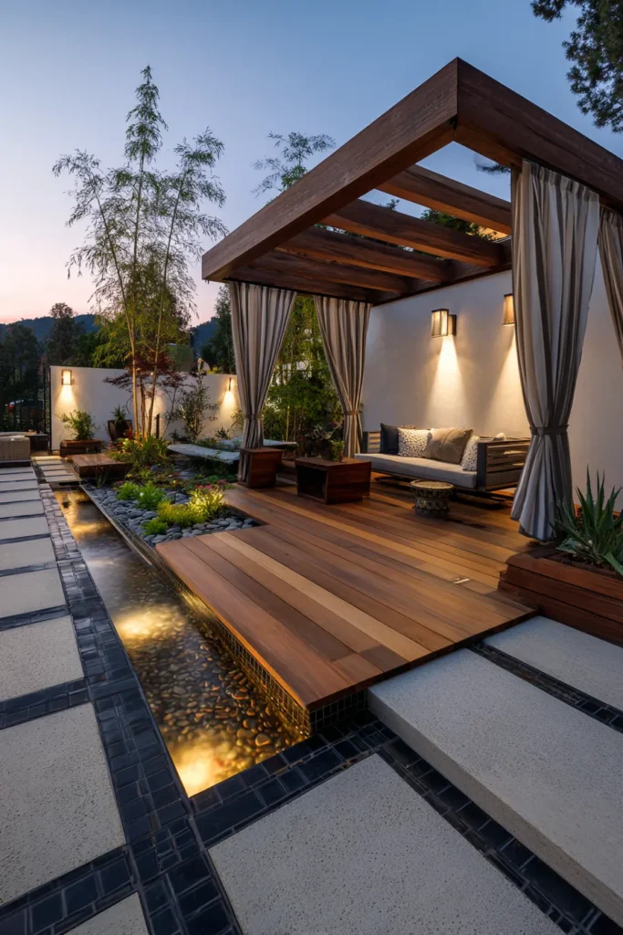 This outdoor space is a stunning study in tranquility and luxurious design, truly transforming a backyard into a peaceful oasis! The deck features a beautiful platform of rich, warm hardwood planks that extends over a breathtaking illuminated water feature with dark, smooth river stones—talk about immediate zen! A gorgeous attached pergola with chunky wood beams defines the lounge area, taking on a chic cabana feel thanks to the flowy neutral curtains that can be drawn for ultimate privacy. The flooring in the patio area combines large, light-colored concrete pavers with dark tiles, creating a sharp, modern pattern. The entire space is backed by clean white walls, softly uplighted by chic sconces, and accented with lovely plantings, including tall, delicate bamboo.