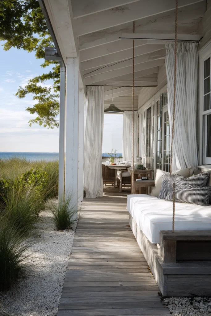 This porch design is absolutely brimming with casual coastal charm and I’m already imagining the sea breeze! It features a beautiful light wood plank deck that flows seamlessly into a border of clean white pea gravel and wispy dune grass, totally setting a beach house mood. The porch roof, acting as a natural attached pergola, is supported by classic white columns and beams. The space is dressed up with sheer, striped white curtains that can be drawn for privacy or shade, adding a super soft, romantic touch. A stunning wooden swing daybed, complete with a crisp white cushion and striped pillows, creates an irresistible lounging spot, while a cozy dining area sits further down the porch, making this a true outdoor living room with an incredible ocean view.