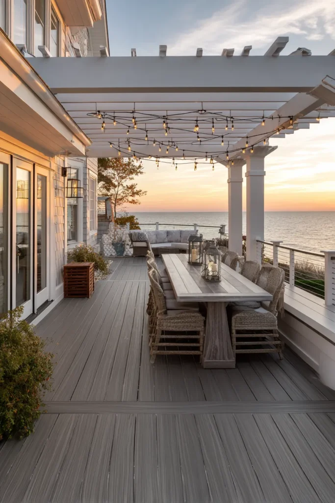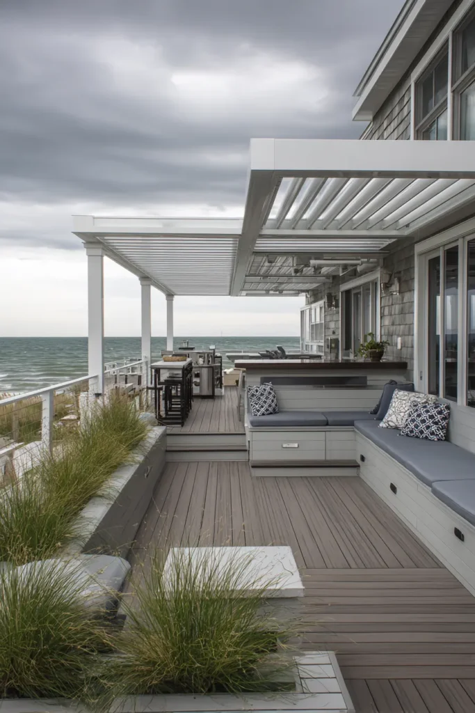 What I absolutely adore about this space is how incredibly functional and chic it is at the same time. The way they integrated the built-in seating and storage is pure genius for keeping things tidy and maximizing space. The white and gray color palette feels so crisp and calming, and the geometric lines of the pergola are just so sharp and modern. This isn’t just a deck, it’s a perfectly designed outdoor retreat that gives you multiple stylish zones for relaxing, dining, or entertaining, all while soaking up that beautiful beachfront atmosphere.