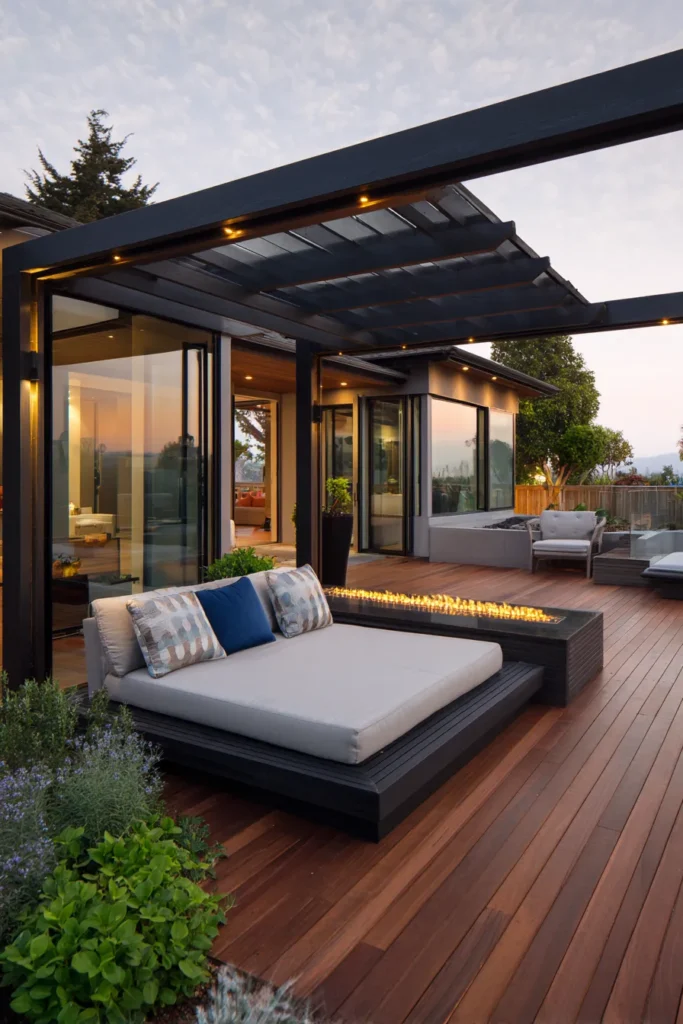 This stunning deck is a true lesson in outdoor luxury and completely captures a high-end, contemporary vibe. It’s built with rich, warm wood planks that stretch out beautifully, contrasting perfectly with the sleek, dark gray exterior of the house and the huge glass sliding doors. The attached black metal pergola with a glass or opaque roof provides a sheltered area that feels both open and intimate. The main attraction is a massive, built-in daybed that looks impossibly comfortable, and it’s backed by a striking linear fire pit that runs the length of the bed. Thoughtful perimeter lighting and subtle low-lying greenery complete this gorgeous, polished look.