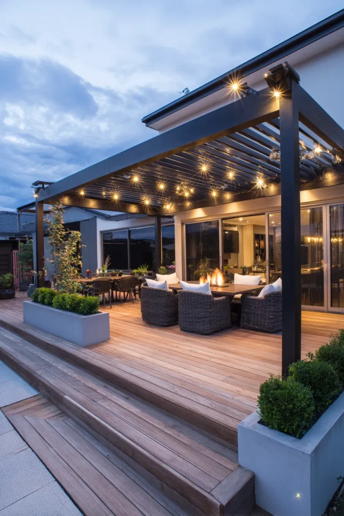 I am completely obsessed with the way the designer blended these different textures and lighting elements—it’s just total perfection! That combination of the warm wood, the stark black pergola, and the soft glow of the ambient lights creates a feeling that’s both dramatic and incredibly cozy. The fire table is the ultimate focal point, making this a space you’d never want to leave. This deck is a shining example of how an attached pergola can transform a simple outdoor area into a multi-functional, glamorous retreat that truly extends your home’s living space in the chicest way possible.