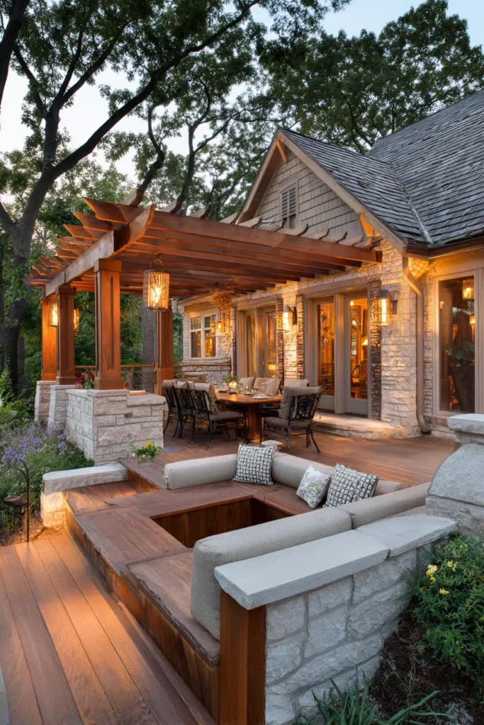 I think this design is just the absolute sweetest combination of rustic charm and incredibly smart function, it makes my heart feel so warm and cozy! That sunken lounge area is seriously my favorite thing ever because it feels so intimate and inviting—a genius way to create a focused gathering space right on the deck. The use of natural materials like the stone and the rich wood keeps everything feeling authentic and grounded. It truly is the perfect, beautiful extension of a classic home that turns a regular backyard into a gorgeous, year-round retreat.