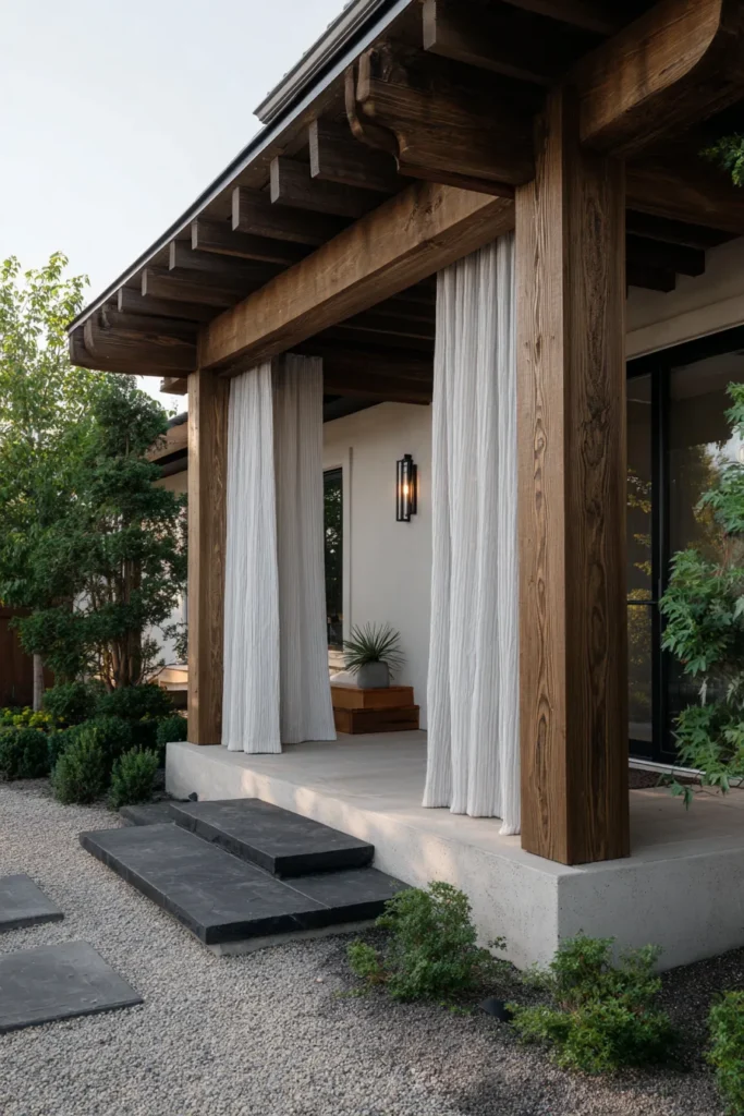 This stunning design has a gorgeous Asian-inspired aesthetic, combining clean modern lines with beautiful rustic elements. The pergola structure is built with thick, richly stained timber beams and columns, giving it a warm, substantial feel. I just adore the way sheer white curtains are hung between the posts; they add privacy, a gentle filtered light, and a touch of soft, breezy romance. The elevated porch and dark stone paver steps create a very tranquil, Zen-like entry, which is perfectly complemented by the simple, gravel landscaping.